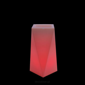 Ozdobna donica podświetlana Nevis w wariancie LED RGB o fantazyjnym, geometrycznym kształcie pozwala na uzyskanie jeszcze bardziej imponujących i niepowtarzalnych efektów wizualnych. Dzięki 16 kolorom podświetlenia dobieranym za pomocą bezprzewodowego pilota stwarza niebywałe możliwości aranżacyjne i sprawia, że produkt znakomicie ozdobi zarówno modernistyczne przestrzenie, jak i te urządzone w tradycyjnym, klasycznym stylu, dodając im szyku i elegancji. Jako przepiękna, niekonwencjonalna lampa o wysokości 75 cm zachwyci swoją funkcjonalnością nawet najbardziej wymagających estetów.